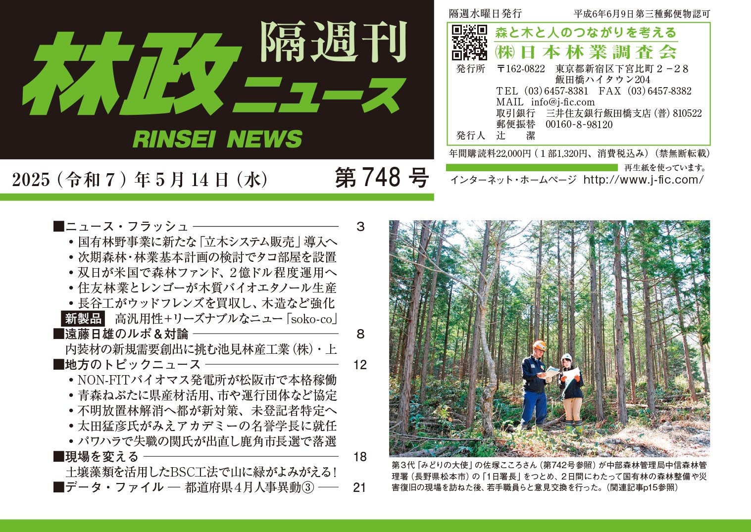 第748号は、国有林に新たな「立木システム販売」導入へ/双日が米国で森林ファンド組成、2億ドル規模の運用目指す/内装材の新規需要創出に挑む池見林産工業/NON―FIT型発電所が松阪で本格稼働/「青森の大型ねぶたに初めて県産材を使用/不明放置林の解消へ東京都が新対策、未登記所有者の特定へ/土壌藻類を活用したBSC工法で山に緑がよみがえる!…などを掲載しています。→詳しくは、こちら