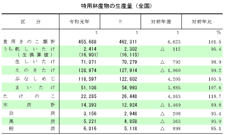 農林水産省は、昨年(2020年)の特用林産物生産統計調査結果をまとめた(6月30日に公表)。食用きのこ類の生産量は46万2,311tで、前年比1.5%の増。たけのこの生産量は2万6,448tで同18.7%増、木炭の生産量は1万2,924tで同10.2%減だった。→詳しくは、こちら